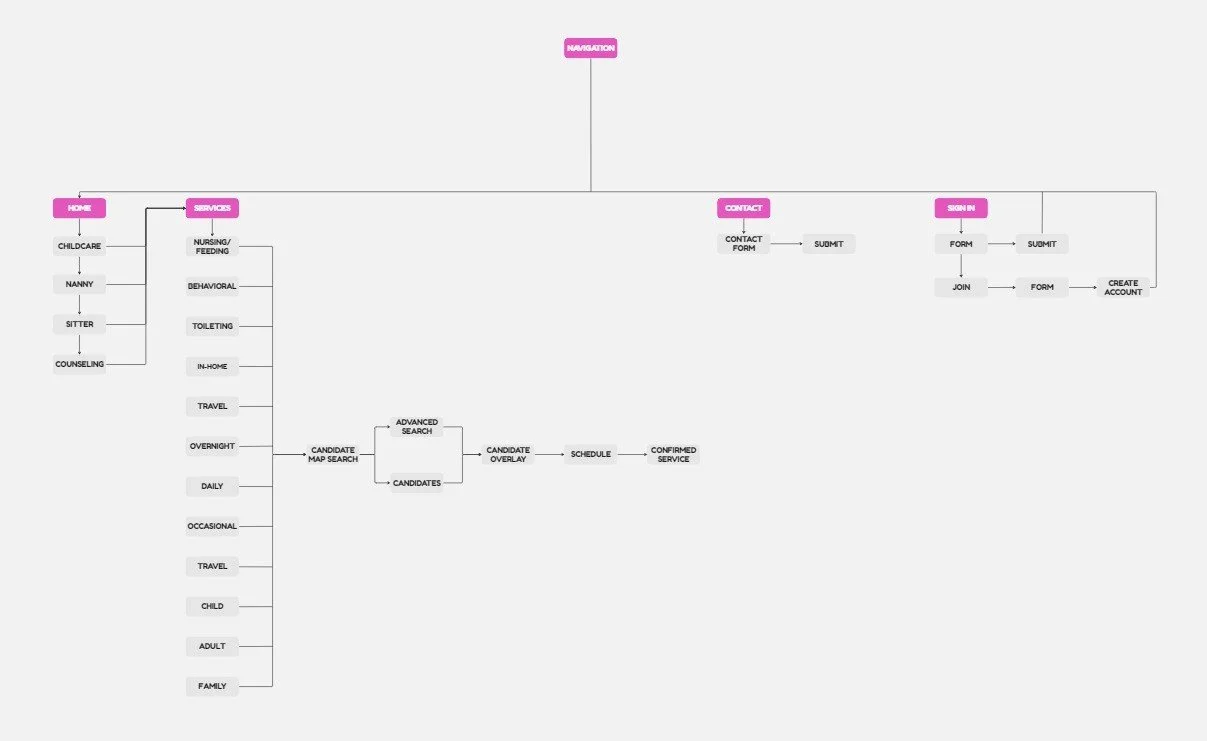 Family dynamics and needs differ across families and households. In-home childcare services are often difficult to locate and establish. The website’s target audience believes receiving support within their homes will meaningfully mend the hassle of coordinating and traveling to receive childcare support. Users want to prescreen candidates and receive support from the comfort of their homes.